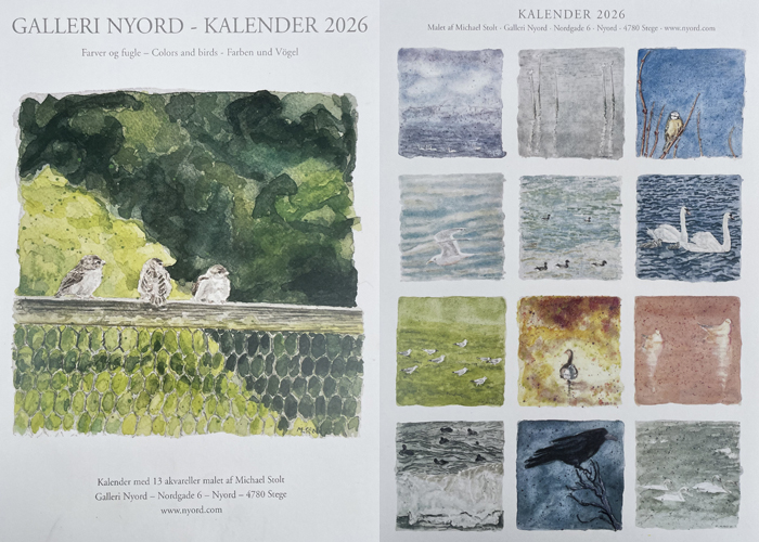 Spriralkalender med 12 farvetryk + forside og oversigt på bagside.